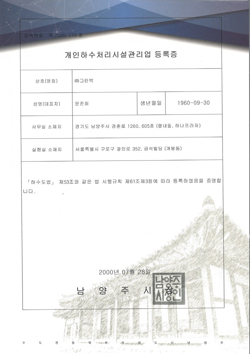 개인하수처리시설등록증 > 인증서